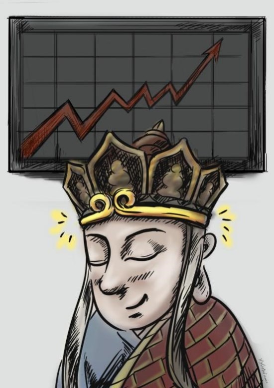 賞析:作品緊扣人物性格特點(diǎn),愛念經(jīng)的唐僧給自己戴上緊箍咒,巧妙彰顯理性投資理念。