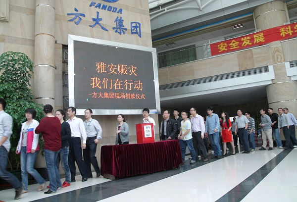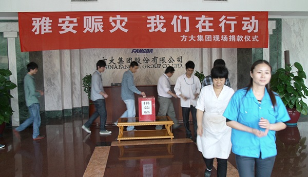 4月20日8時(shí)02分,四川省雅安市蘆山縣發(fā)生7.0級(jí)地震,人民生命財(cái)產(chǎn)遭受重大損失。一方有難,八方支援。在雅安人民在遭受災(zāi)難的時(shí)候,方大集團(tuán)在第一時(shí)間號(hào)召集團(tuán)全體員工為災(zāi)區(qū)捐款,支持雅安人民抗震救災(zāi)。集團(tuán)總部和分布在北京、上海、成都、沈陽(yáng)、南昌、東莞等全國(guó)各地的方大集團(tuán)員工紛紛捐款,以實(shí)際行動(dòng)獻(xiàn)愛(ài)心。據(jù)不完全統(tǒng)計(jì),截至4月23日,方大集團(tuán)已經(jīng)向雅安地震災(zāi)區(qū)捐款已達(dá)257462元,以幫助災(zāi)區(qū)人民重建家園,與災(zāi)區(qū)人民一起共渡危難。這也是繼向汶川、玉樹(shù)地震災(zāi)區(qū)捐款后,方大集團(tuán)再一次向震區(qū)人民伸出援手,是方大集團(tuán)“報(bào)國(guó)報(bào)民報(bào)一方”大愛(ài)精神的再次彰顯。