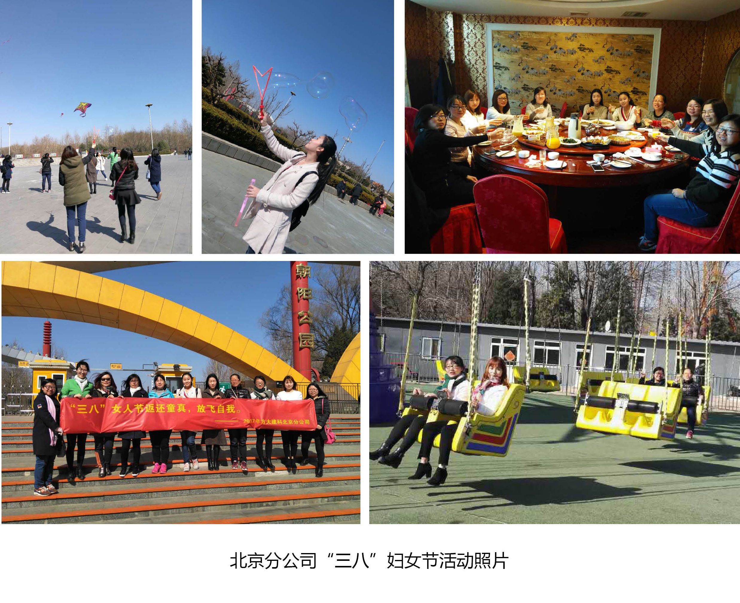 在北京,北京分公司的每位女員工們節(jié)日當(dāng)天一大早就收到了公司精心準(zhǔn)備的一束玫瑰花;中午下班后女員工們?cè)诓妥郎淆R聚一堂,舉杯慶祝,祝愿彼此節(jié)日快樂(lè),共度美好時(shí)光;下午,北京分公司的女員工一同前往朝陽(yáng)公園踏青游玩,在藍(lán)天白云下,放風(fēng)箏,吹泡泡,在游樂(lè)場(chǎng)體驗(yàn)著驚險(xiǎn)刺激的項(xiàng)目,玩的不亦樂(lè)乎。