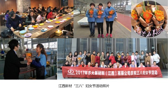 在南昌,江西新材組織了以“愛(ài)自己、愛(ài)生活”為主題的婦女節(jié)系列活動(dòng),共54名女員工參與其中?;顒?dòng)內(nèi)容包括:向女同事送花、合影留念、自助火鍋用餐等。3月8日上午,江西新材行政人事部經(jīng)理吳宇華帶領(lǐng)送花小分隊(duì),向正在崗位上工作的各位女同事遞上一束艷麗的花,表達(dá)公司對(duì)女員工節(jié)日問(wèn)候。中午時(shí)間,全體女員工在廣場(chǎng)合影留念,隨后前往一回旋自助火鍋店聚餐。江西新材以平凡簡(jiǎn)單的方式,贏得了女員工們滿滿的感動(dòng)。女員工們紛紛表示,今年的“三八”婦女節(jié)系列活動(dòng)有驚喜、有創(chuàng)新、更有感動(dòng)。