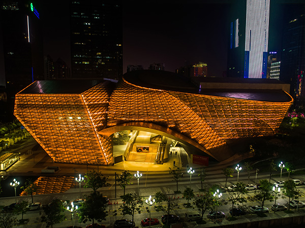 深圳市當代藝術館與城市規劃展覽館坐落于深圳中心區中軸線上,是中心區最后一個大型公共文化建筑,總建筑面積約8萬平方米。作為推廣新銳藝術、展示城市的新地標,該建筑以柔和的空間造型和藝術形象引起了廣泛的關注。該項目采用了大量的三角形玻璃幕墻及三角形穿孔不銹鋼+玻璃的雙層幕墻,實現了外立面傾斜、扭曲和旋轉的曲面變化,在確保最佳的采光效果同時,兼顧了遮陽、亮化等功能性需要,極富想象力和生命力,但也對幕墻平整度、施工精細度等帶來極大的挑戰。方大建科的工匠們,克服了幕墻形式復雜、材料品種規格多、施工精度高等種種困難,打造了這座兼具美感和功能性的“表皮”。