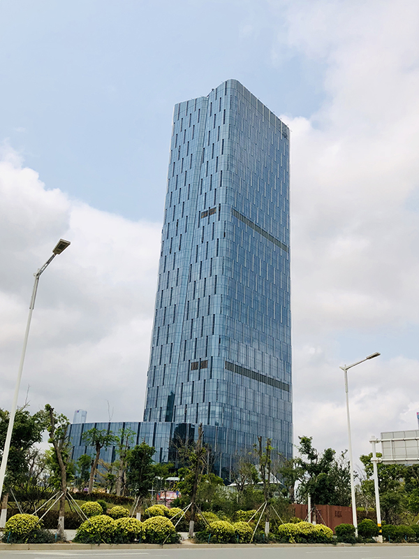 深圳·金利通金融中心位于深圳市寶安區,建筑高度211m,幕墻類型主要是單元式玻璃幕墻、石材幕墻、鋁板幕墻。建筑外立面端莊大氣,每個立面從底部至頂部斜向分布了400mm×390mm的鋁板裝飾柱,裙樓采用25mm厚花崗巖、鋁合金掛件系統,面板錯縫設計,搭配橫向通長玻璃條窗及石材凹槽造型,整個立面顯得錯落有致。項目團隊及時解決合作中碰到的問題,克服了工期緊、任務重、質量高等種種困難后,打造出一個集寫字樓、城市公館、裙樓商業為一體的“前海花園式集約化高端商務綜合體”。