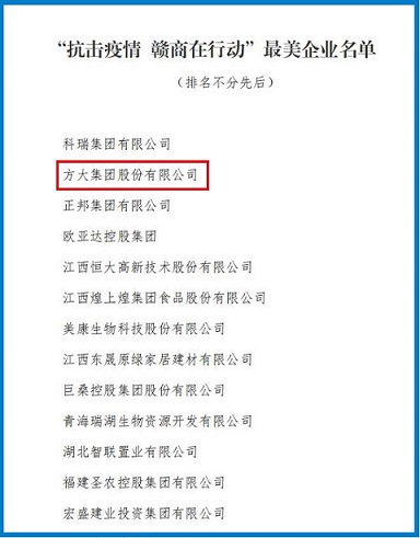 近日,江西贛商聯(lián)合總會、贛商雜志社發(fā)布關(guān)于表彰在“抗擊疫情 贛商在行動”活動中最美商會、最美企業(yè)、最美企業(yè)家的通報,表彰贛商企業(yè)和江西商會在抗擊疫情中做出的突出貢獻(xiàn),方大集團(tuán)榮獲最美企業(yè)稱號。