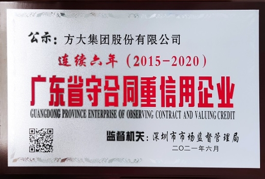近日,廣東省市場(chǎng)監(jiān)督管理局的2020年度“廣東省守合同重信用企業(yè)”評(píng)選揭曉,方大集團(tuán)憑借優(yōu)秀的公司治理及合同管理連續(xù)六年(2015-2020)榮獲“廣東省守合同重信用企業(yè)”稱(chēng)號(hào)。